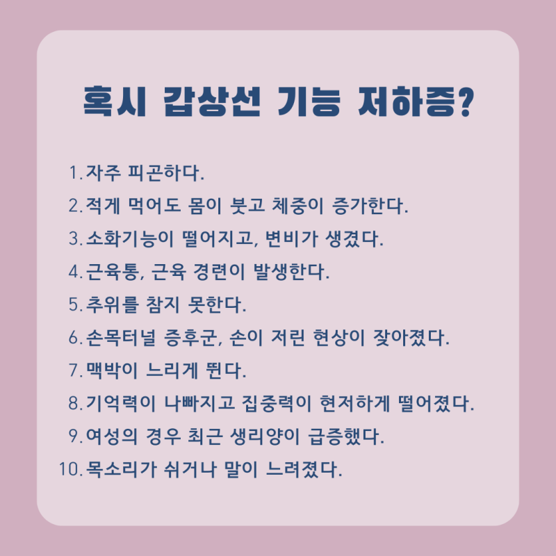1. 피로감 갑상선 호르몬이 부족하면 에너지가 항상 부족하고 피곤해서 쉬어도 피로감이 유지됩니다. 2. 체온 조절 기능 저하 남들보다 더위와 추위에 잘 타며 신체 체온조절 기능이 저하됩니다. 3. 체중 증가 갑상선 기능 저하로 인해 신진대사가 느려지면 체중이 증가하게 됩니다. 4. 피부건조 갑상선 호르몬은 피부의 수분량을 유지하는 데 도움을 주기 때문에 저하 시 피부가 건조해지고 가려움증이 생길 수 있습니다. 5. 우울감 세로토닌이나 도파민 분비에 영향을 미치기 때문에 기분이 가라앉아 우울하고 기억력 저하 등이 나타납니다. 6. 장 연동 운동 저하, 장 연동 운동 저하로 소화 기능이 느려지고 변비가 자주 발생할 수 있습니다. 7. 목소리 변화 성대 주위에 부종이 발생하고 목소리가 낮아져 느려지는 등의 변화가 생길 수 있습니다. 1. 피로감 갑상선 호르몬이 부족하면 에너지가 항상 부족하고 피곤해서 쉬어도 피로감이 유지됩니다. 2. 체온 조절 기능 저하 남들보다 더위와 추위에 잘 타며 신체 체온조절 기능이 저하됩니다. 3. 체중 증가 갑상선 기능 저하로 인해 신진대사가 느려지면 체중이 증가하게 됩니다. 4. 피부건조 갑상선 호르몬은 피부의 수분량을 유지하는 데 도움을 주기 때문에 저하 시 피부가 건조해지고 가려움증이 생길 수 있습니다. 5. 우울감 세로토닌이나 도파민 분비에 영향을 미치기 때문에 기분이 가라앉아 우울하고 기억력 저하 등이 나타납니다. 6. 장 연동 운동 저하, 장 연동 운동 저하로 소화 기능이 느려지고 변비가 자주 발생할 수 있습니다. 7. 목소리 변화 성대 주위에 부종이 발생하고 목소리가 낮아져 느려지는 등의 변화가 생길 수 있습니다.